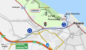 Giunti al semaforo, prendere a destra direzione Ancona/Mare procedendo sulla SS 16 Adriatica, quindi procedere per circa 2 Km. e alla rotatoria girare a sinistra direzione Baia Flaminia.